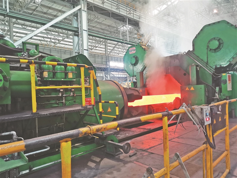 建龍北滿特鋼特冶鍛造廠鍛造作業區精鍛機正在鍛造鋼坯。本報記者吳玉璽攝