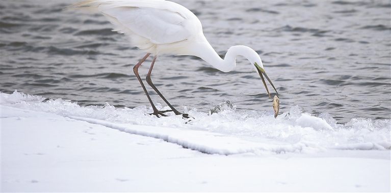 近日,松花江哈爾濱城區段船廠水域,江面局部已經碎裂成大大小小的冰排。一大群北歸的白鷺、蒼鷺以這些冰排為“釣臺”,站在上面伸長脖子,“垂釣”冰隙間露出的各種小魚。