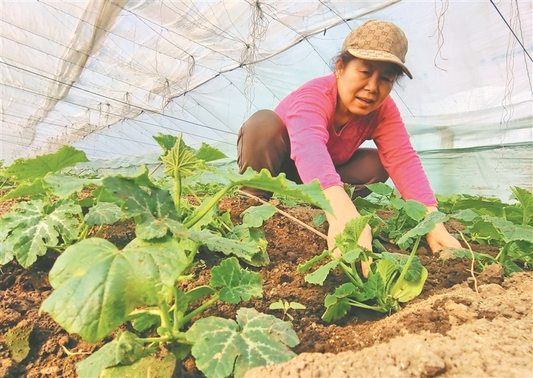近日,哈爾濱市道里區新發鎮五星村的大棚里,菜農王秀梅正為黃瓜苗松土。王秀梅說,這些黃瓜苗在十天前移栽到了大棚里,長勢非常好。她家種了兩個棚的黃瓜,能產出3萬斤左右,預計在“五一”后采摘上市。