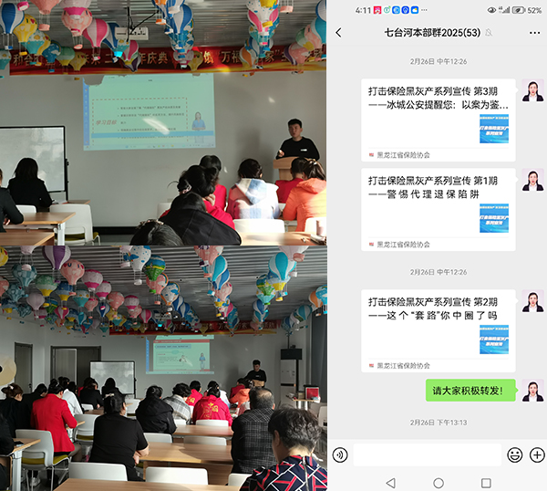 在此次打擊“代理退保”宣傳活動中,七臺河中支利用微信工作群、微信朋友圈轉發宣傳內容,詳細剖析了黑灰產的常見運作模式,非法“代理退保”可能給消費者帶來的四方面風險:一是資金受損風險;二是喪失正常保險保障的風險;三是個人信息泄漏風險;四是相關行為可能導致消費者面臨訴訟等法律風險。號召廣大群眾增強風險防范意識,警惕非法“代理退保”套路。