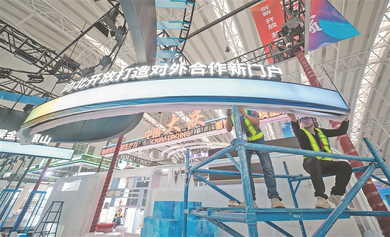 5月14日,距離哈洽會開幕還有三天時間,記者來到第34屆哈洽會展館施工現(xiàn)場,各區(qū)域展臺已搭建成型,施工工人們正在有條不紊地裝飾展區(qū)細節(jié)部分。