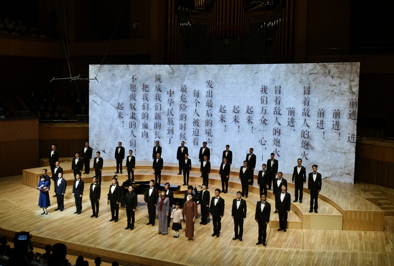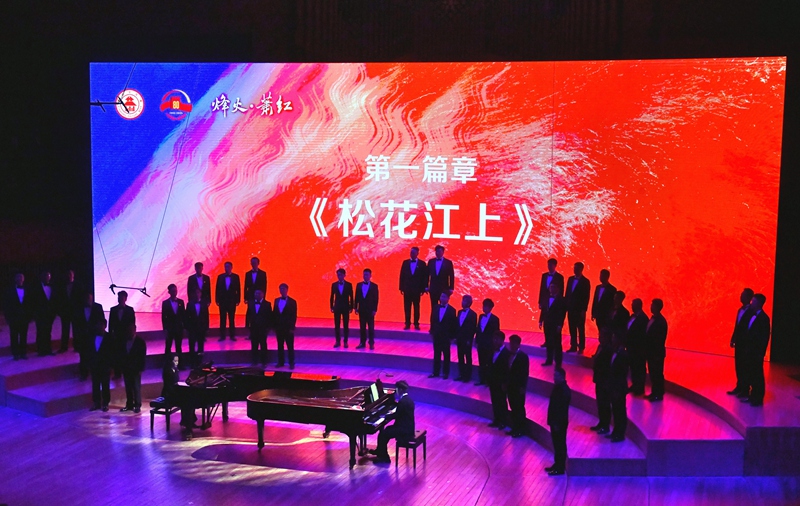 第一篇章《松花江上》以《長城謠》的泣血鄉愁與《義勇軍進行曲》的全場肅立高唱,訴盡抗戰時期的流亡之痛與民族豪情,更創新植入“童年、少女、青年”三代“蕭紅”扮演者(張舒涵、鄭楚琪、尤泓斐)與合唱團的情景互動。第二篇章《抗戰的烽火》中,《五月的鮮花》《露營之歌》《保衛黃河》等作品以合唱與立體站位,緬懷趙一曼、楊靖宇等英烈,再現全民抗戰的壯闊圖景。第三篇章《文脈永續》則通過魯迅、茅盾等文學名家對蕭紅的評價、跨年代讀者代表致敬及《致祖國》的磅礴合唱,彰顯其文學精神在新時代的傳承。