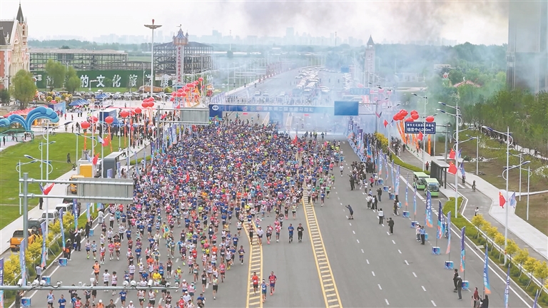隨著發令槍響,選手們如離弦之箭般沖出起跑線,他們身著各式運動服,與樂安新區的生態賽道交相呼應,形成了一道亮麗的風景線。
