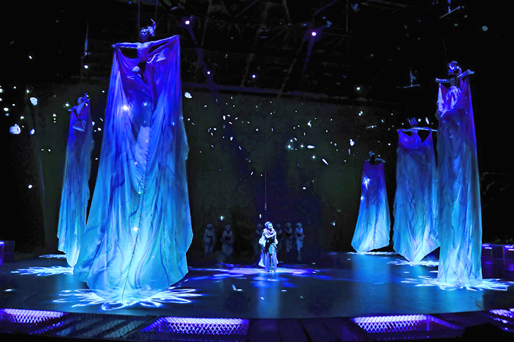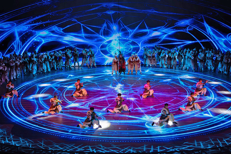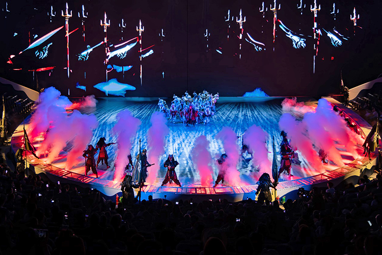 全新的演出以游戲玩家視角展開,當游戲開始,巨大的環形地幕瞬間點亮,蒼茫的北境雪原鋪展開來,激光投影在穹頂交織出流動的光幕,與升騰的煙霧交融,千年前的部落場景躍然眼前。