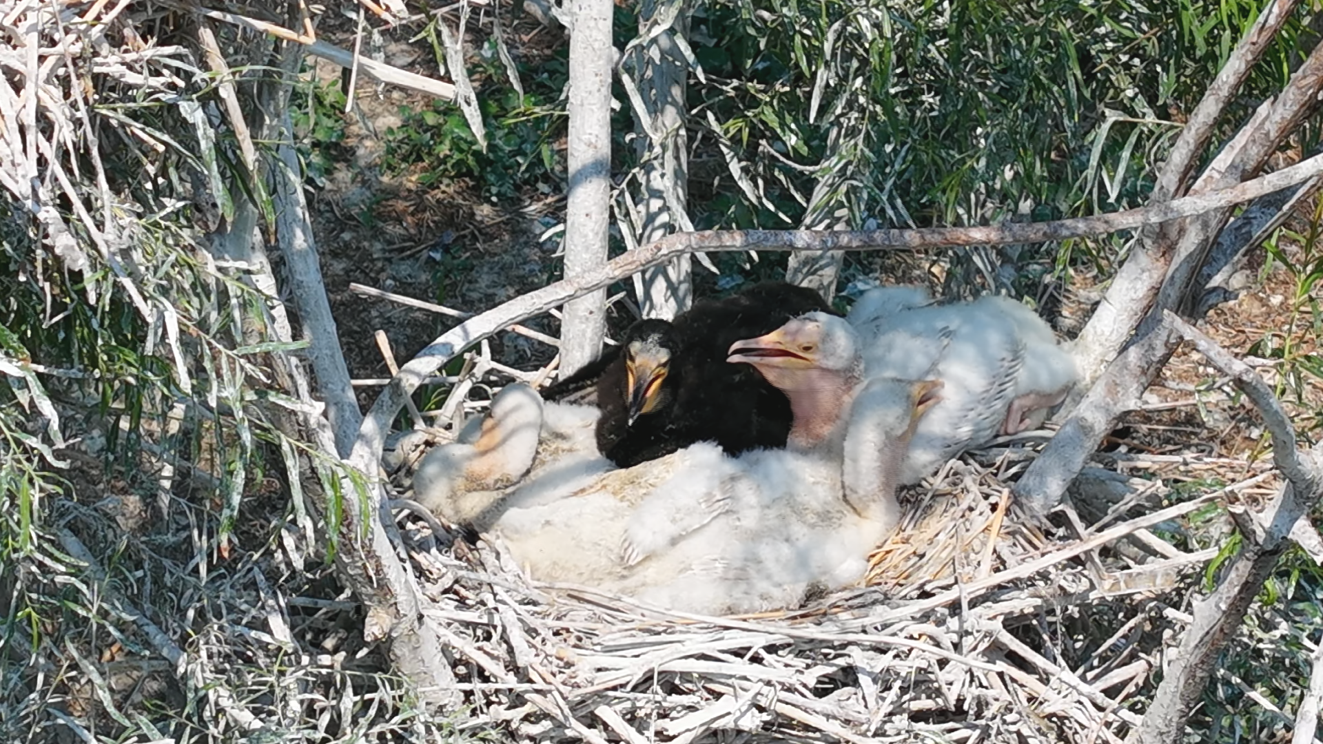 此次白鸕鶿的現身頗具意外之喜。工作人員在日常巡護時發現了這窩與眾不同的鸕鶿,后確定為極為罕見的白鸕鶿。據初步統計,此次現身的白鸕鶿約有三四只,而且還是和黑色的鸕鶿在同一巢穴,這一現象更為罕見。