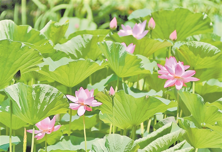 7日迎來小暑節氣,此時節也正是荷花盛放之時。哈爾濱市道里區雨陽公園內,碧綠的荷葉鋪滿池塘,含苞待放的花蕾在風中搖曳,粉色的荷花競相綻放。