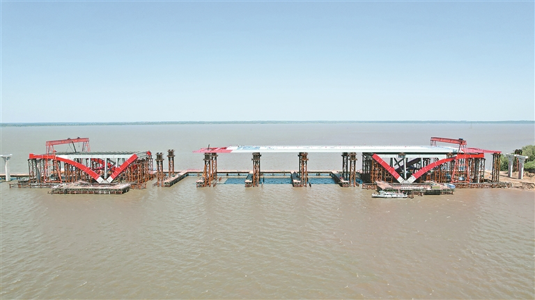當下,北環項目全線各工區施工現場一片忙碌景象。松花江特大橋主航道拱橋的施工現場,正在緊張地進行主跨鋼梁頂推施工,備用航道斜拉橋已完成主塔交匯段施工,目前正在進行上塔柱施工。與此同時,引橋正在進行墩柱、蓋梁及梁板安裝施工。項目主線上,路面水穩基層正在施工,排水防護多作業面同步推進。