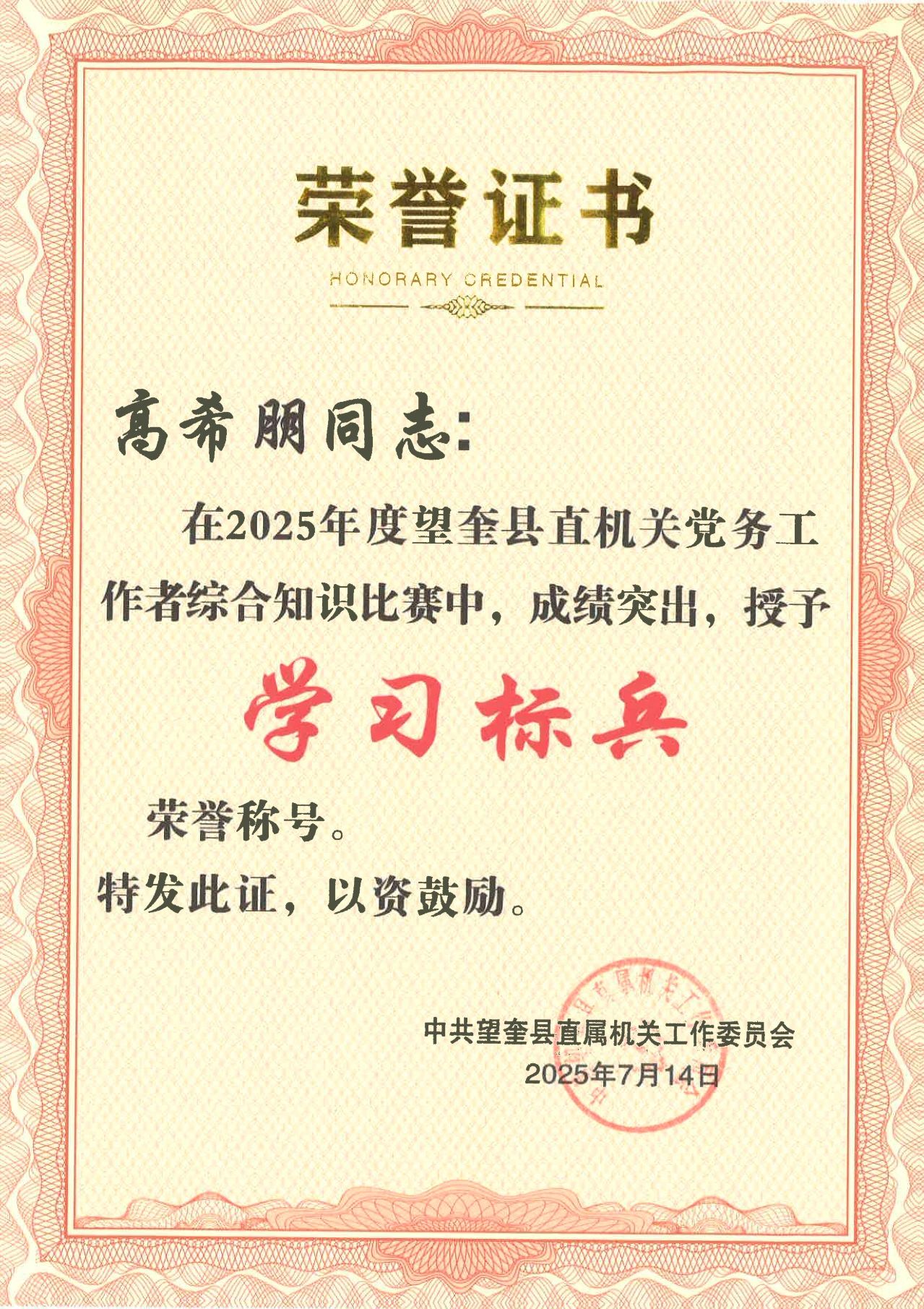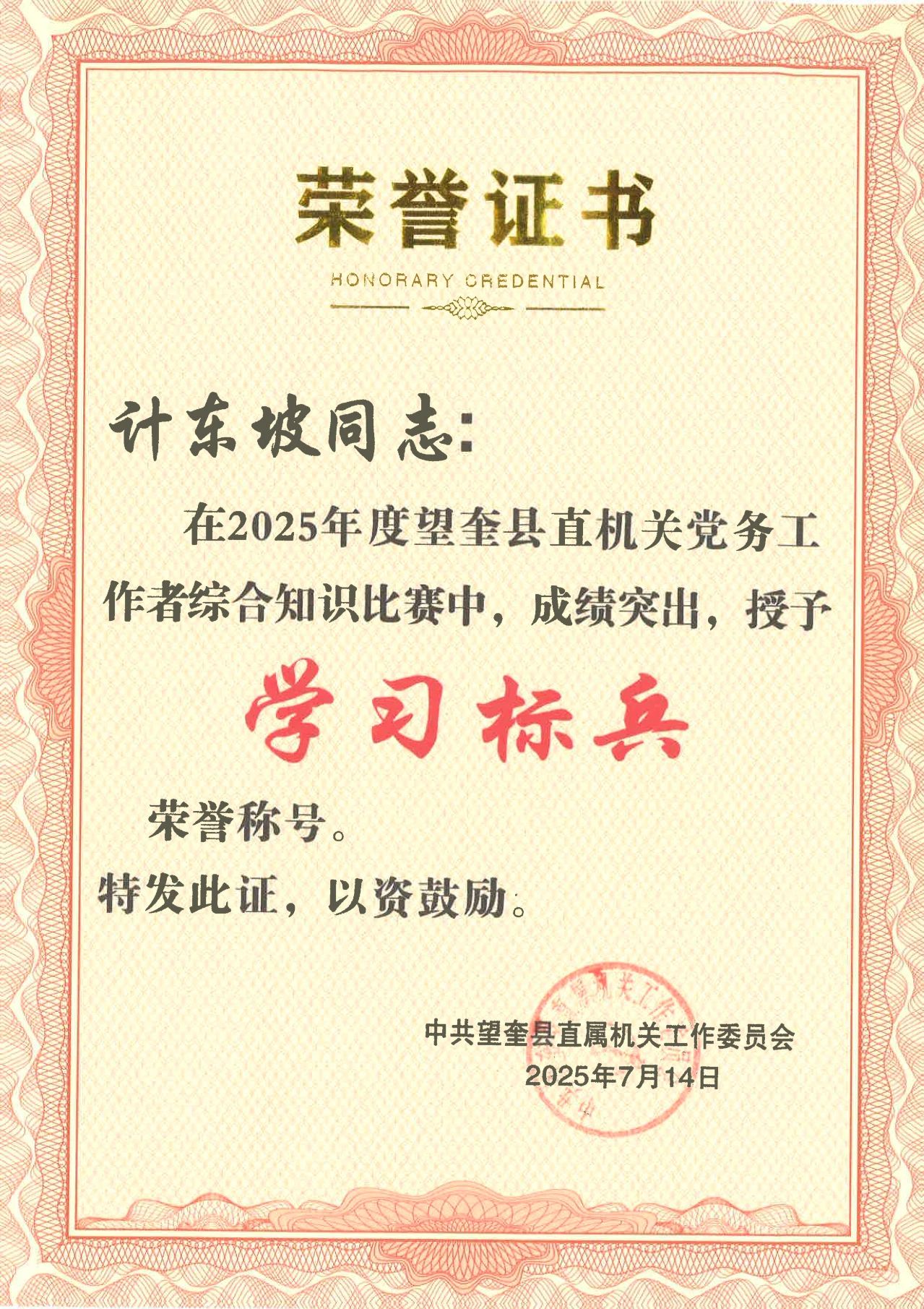 黑龍江經濟網訊(董慧螢 徐金玲 記者馬朝林)近日,在望奎縣直機關工委組織開展的黨務工作者綜合知識測試中,望奎縣人民法院審管辦副主任計東坡、衛星法庭員額法官高希朋兩位同志憑借扎實的理論功底和過硬的專業素養,從眾多參賽者中脫穎而出,雙雙榮獲“前十名”的優異成績,被縣直機關工委授予“學習標兵”稱號。