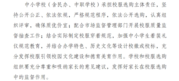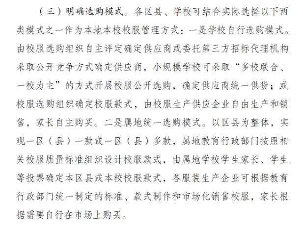 新規(guī)設計的“自行選購模式”靈活且務實:規(guī)模較大的學校可自主評定供應商或委托第三方招標;小規(guī)模學校可采取“多校聯(lián)合、一校為主”的方式降低采購成本;甚至允許“確定款式后,由企業(yè)市場化生產(chǎn)銷售,家長自主購買”。新規(guī)嚴禁“定點”“定商標”干涉交易,不得設置不合理入圍條件,確保所有合規(guī)企業(yè)都能公平參與競爭。