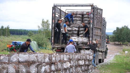 加格達奇林業局林場職工將大鵝運輸籠裝車(林佳晨 攝)