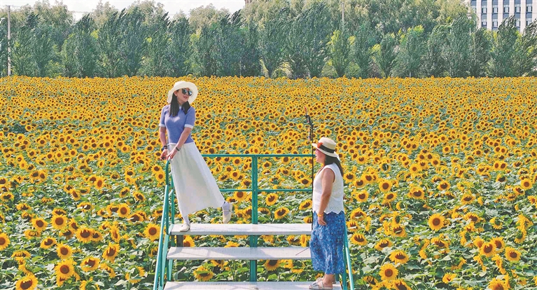 近日,哈爾濱市東方學院的校園里,30萬株向日葵進入盛花期,層層疊疊的金黃花瓣在校園里組成金色矩陣,連蜂蝶振翅都沾滿蜜糖色的光斑。風掠過時,葉片翻卷出翡翠色的浪涌,花盤碰撞發出細雨般的窸窣聲,空氣里浮動著類似烤面包的溫暖香氣?;êig的小橋上,愛花的市民在這里打卡拍照,定格最美瞬間。