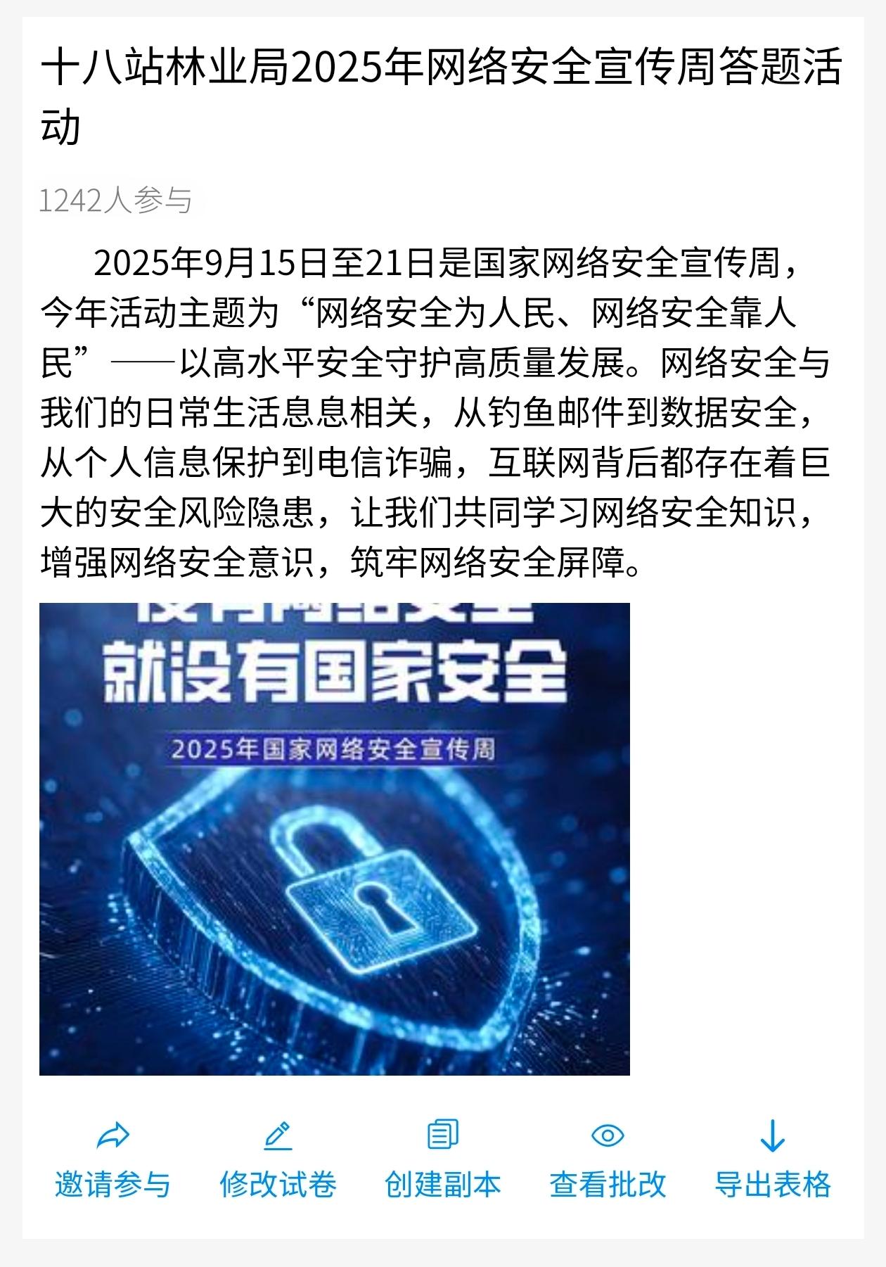 為進一步擴大宣傳覆蓋面,在公眾號上推出“網絡安全知識有獎答題”活動,涵蓋了《網絡安全法》《個人信息保護法》、密碼安全、辦公環境安全等多個方面,在互動中深化了對網絡安全知識的理解與掌握,形成了線上線下協同推進的宣傳合力。