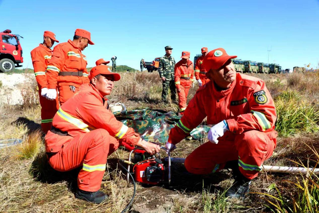 阿木爾林業局專業撲火隊員利用便攜式水泵在水源旁取水(王力 攝)