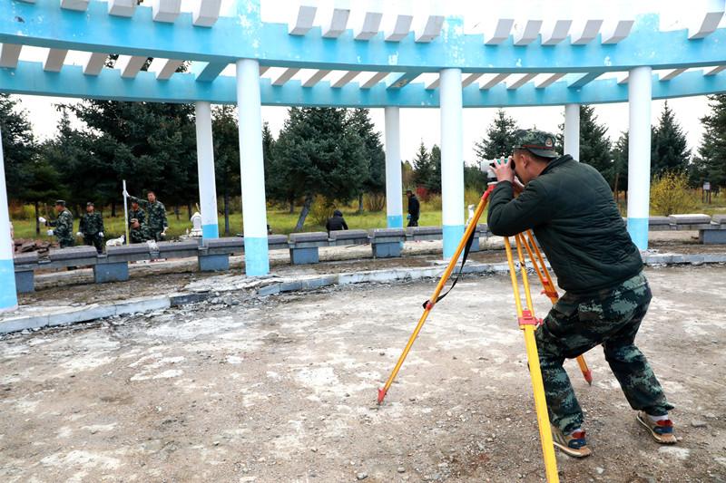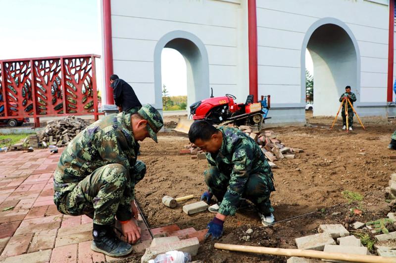 施工現場另一邊,林業局森林消防一大隊承擔著北極植物園酒莊大門步道磚的施工任務。通往酒莊的道路上,白色線繩將施工區域切割成規整的“豆腐塊”,隊員們在打好水穩層的網格區域內精準作業,確保每一塊步道磚都橫平豎直。“爸爸在山頂瞭望,守護山林,我在山下參與建設,我們父子二人既是建設者,也是‘森林衛士’,以不同的方式守護著‘美麗阿木爾’”,森防隊員梁光輝說。隊員們正在參加建設,但森防給養、撲火機具早已裝車,一旦有火情,便能立刻投入滅火戰斗。
