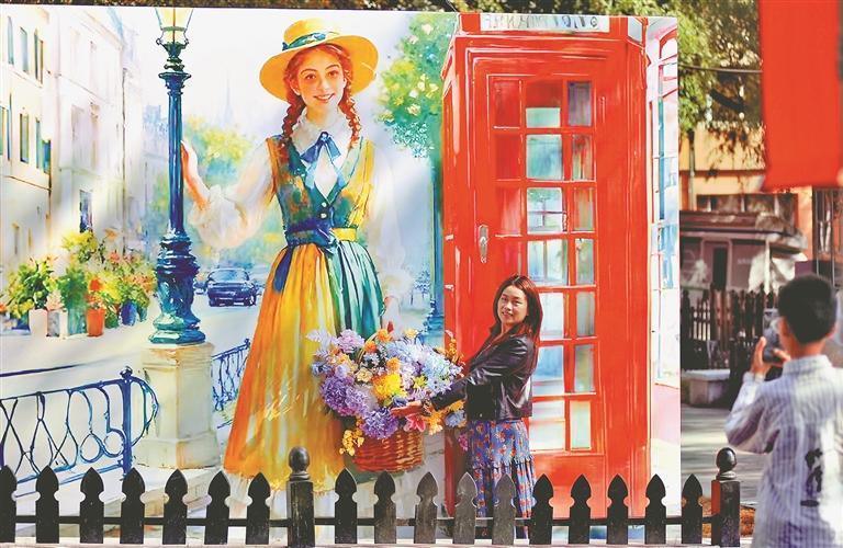 2日,哈爾濱市南崗區花園街歷史文化街區,節日氣氛濃厚,游客們紛紛在“黃房子”旁打卡拍照。