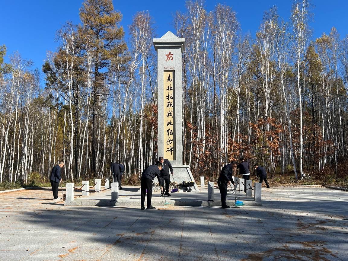 9時40分,全體參與人員乘車前往革命烈士紀(jì)念碑墓地,開啟致敬英烈活動。活動現(xiàn)場,全體人員手持清掃工具,認(rèn)真清理紀(jì)念碑周圍的落葉與雜草,以實際行動表達(dá)對革命先烈的緬懷與敬意。