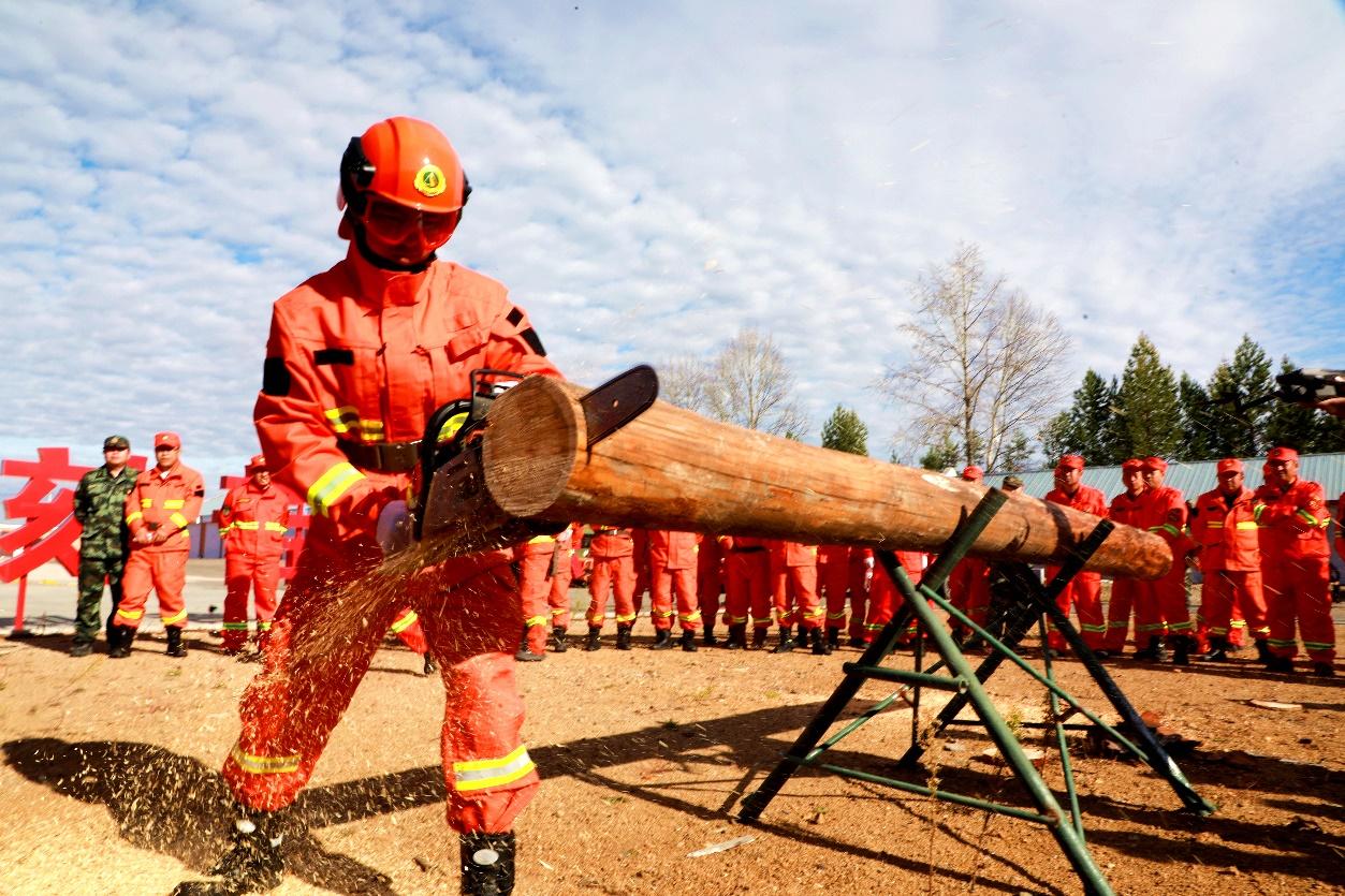阿木爾林業(yè)局撲火專業(yè)隊(duì)員在進(jìn)行油鋸割木競賽(王力 攝)