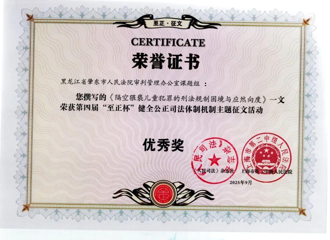 黑龍江經濟網訊(董慧瑩 王岳)近日,由《人民司法》雜志社與上海市第二中級人民法院聯合舉辦的第四屆“至正杯”健全公正司法體制機制征文活動結果揭曉。本屆征文共收到投稿1500余篇,經評委會認真評議,共評選出一等獎5篇、二等獎15篇、三等獎50篇、優秀獎60篇。其中,肇東市人民法院審管辦(研究室)課題組撰寫的調研論文《隔空猥褻兒童犯罪的刑法規制困境與應然向度》榮獲優秀獎。