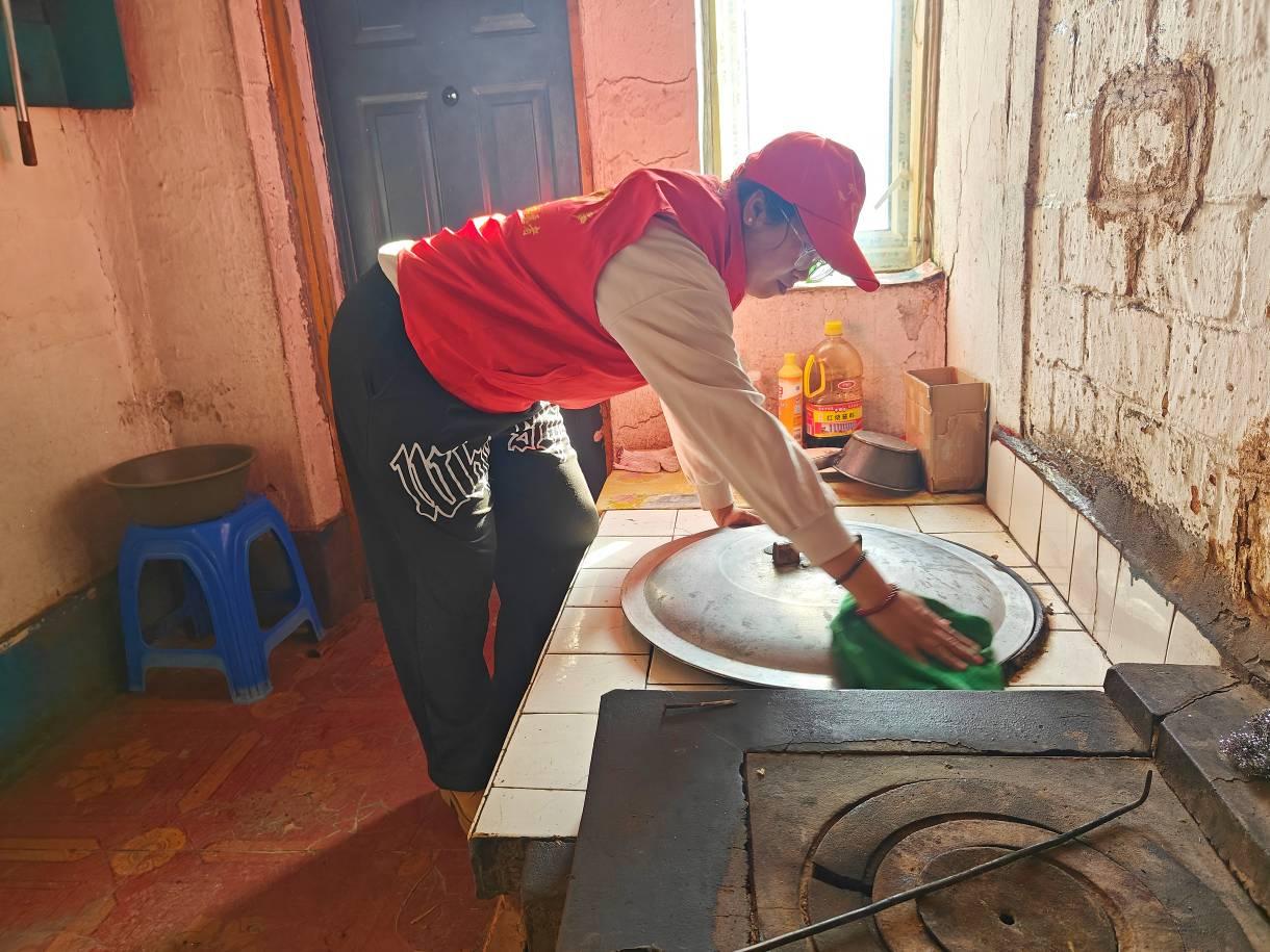 林場志愿者在幫助困難職工打掃衛生(朱旭 攝)